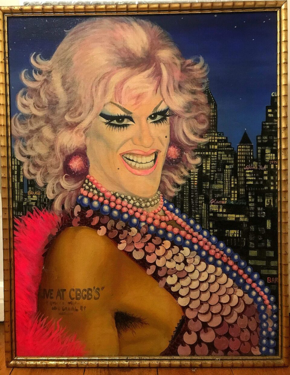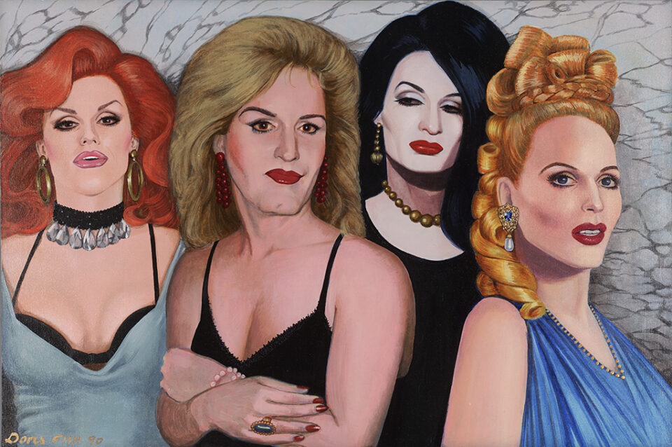 Commissioned by Bob Davis, Doris painted this in 1990. From the left, Doris Fish, Ms. Bobbie Davis, Miss X, Tippi.