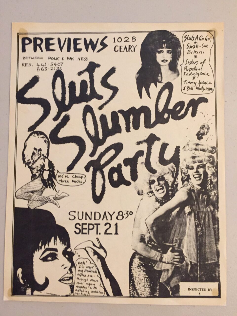 Sluts Slumber Party, Previews September 21, 1980. Design by Doris Fish. Miss X Collection Sluts Slumber Party Held at Previews performance space at Polk and Geary September 21, 1980, during the hiatus between Sluts A Go-Go: A Play with Music and the premiere of Blonde Sin. We are short on details, this was likely a…
