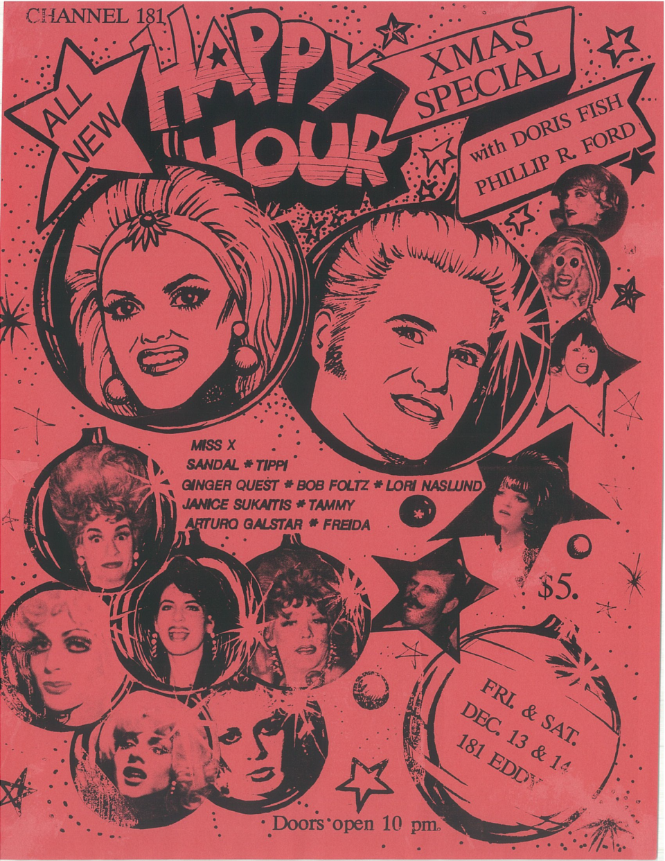 Happy Hour X-Mas Special flyer. December 1985 From the collection of Phillip R Ford. Phillip R Ford, Doris Fish, Miss X, Ginger Quest. Photo by Robin Clark Doris Fish and Phillip R Ford, Happy Hour Show, 1985. From the collection of Phillip R Ford. Gwyn Waters was a photographer documenting the San Francisco Punk scene…