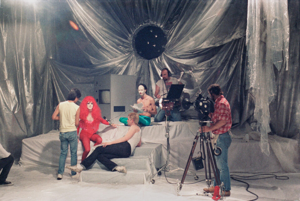 Tippi on the set of Vegas in Space, as director Phillip R Ford makes adjustments to the set. 1984 Photo by Daniel Nicoletta @dannic100NOT FOR DISTRIBUTION WITHOUT PERMISSION