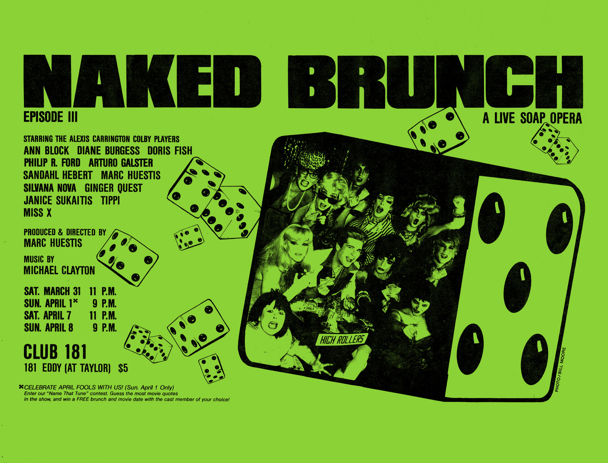 Created by Marc Huestis and performed at the Tenderloin Club 181, Naked Brunch was a “beatnick soap opera” in four episodes in 1984. Huestis was eager to create a project with Doris Fish, by then the most famous drag queen in town after the success of Blonde Sin at Hotel Utah. The Sluts (Miss X, Tippi, and Ginger Quest) along with their new director/producer Phillip R Ford joined a cast that included future Vegas in Space cast members Silvana Nova, Arturo Galster, Tommy Pace and Sandahl Hebert (Kincaid). This was between filming principal photography of Vegas in Space in 1983 and 1985. The show was wildly popular and was in the vanguard of episodic drag theater that has since become a mainstay of drag.