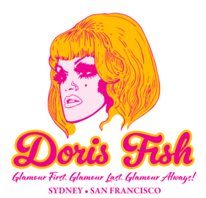 The Doris Fish Forever logo featuring a Doris Fish self-portrait taken from the 1979 Sluts A Go-Go show flyer. Updated with the Glamour First motto and Sydney • San Francisco mark.