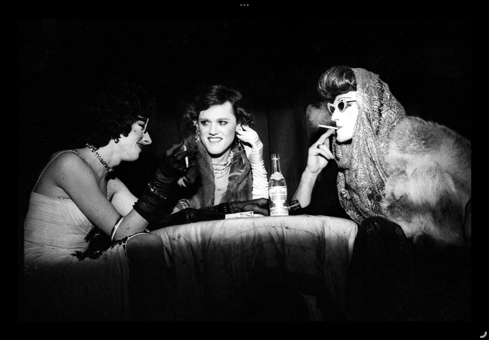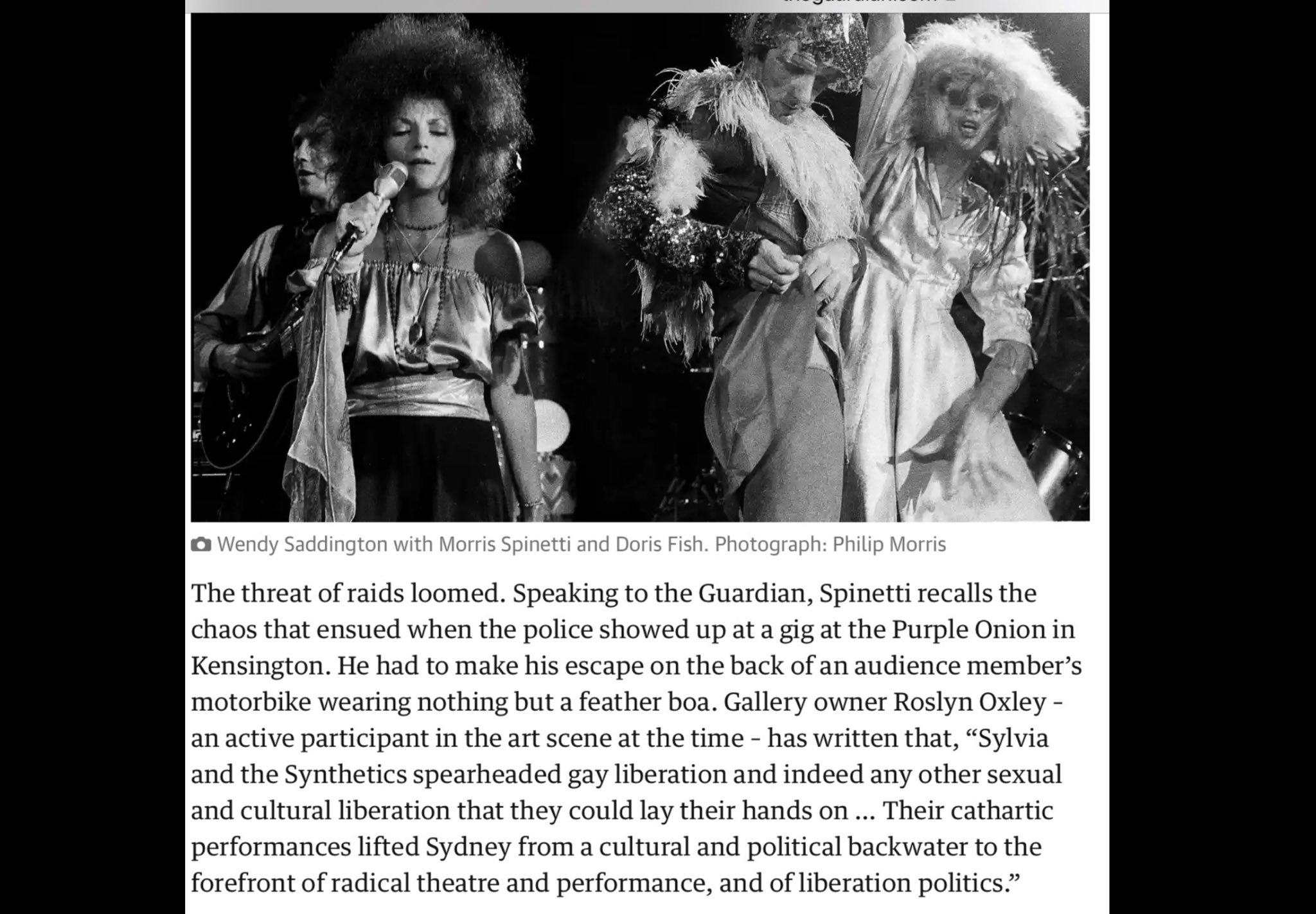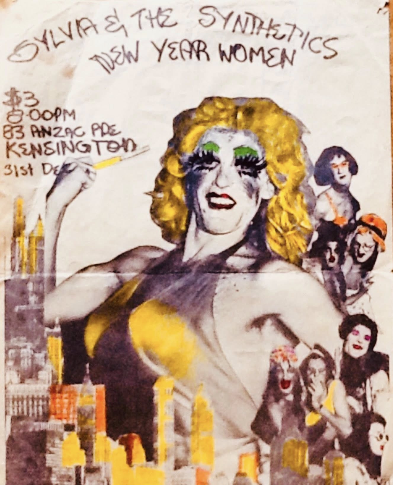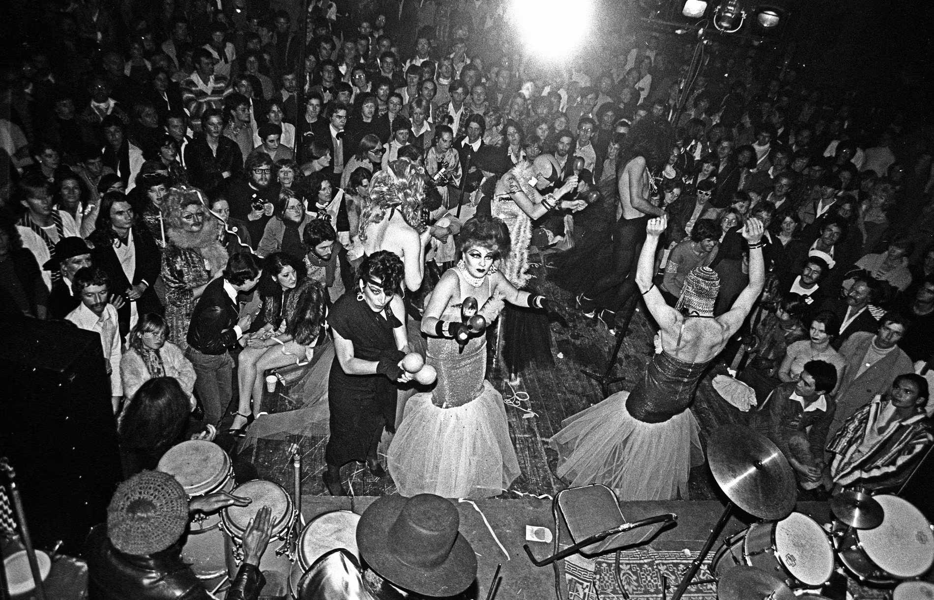 I remember one performance of things we did do. It was a New Year’s Eve Show in an old dis-used theatre club. We were already the darlings of the hip and art set and the hall was packed. The show opened with a gorgeous muscle-man centre stage. Onto his broad shoulders descended a young, pretty (fake) woman. The rest of us danced on in fishnet stockings and tails as the “heroine” sang about her breaking heart. She then took her heart from her breast and ate it. The blood dripped onto her powder blue debutante gown. At various times during the evening we threw fish, flowers, candy and glitter at the eager audience. We whipped and kicked each other and removed our frocks. The whole hall was soon filled with naked bodies. The police later arrived and arrested some rowdy people who were living in the gutter.