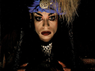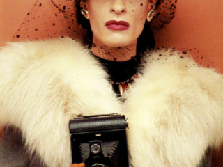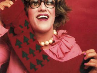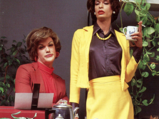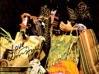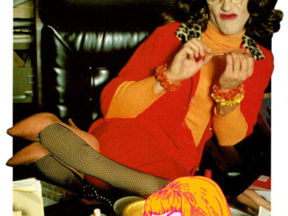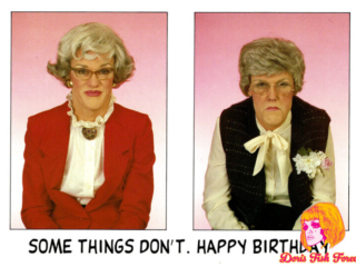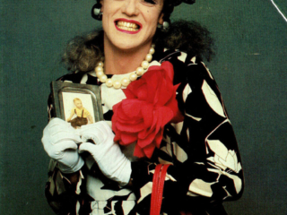 Doris’ first two images were one of her looking fabulous in a beauty parlor chair and a yellow wig [ This time you’re going to need more than a comb out ] and a birthday card featuring her as a bag lady rifling through the trash [ I’m still picking out your gift! ]. I remember she came home from that bag lady shoot rather disenchanted. “This isn’t real modeling, it’s COMEDY modeling!” Regardless it turned out to be a partnership made in heaven. Randy West and his partner David Lindsay were absolute angels. Over the nearly ten years we all worked together,: fluidly, seamlessly, no spats, all collaboration. No matter how unflatteringly she was shot, Doris always insisted on at least a few “glamour shots” usually at the beginning of the shoot when she was still looking fresh and before she was doused with water [ Sorry you got dumped on ] or covered in oatmeal [Today the shit hit the fan ] or some other combination of ingredients [ Your name came up at lunch ]. We were paid per each image used and occasionally even for those not used. We met 2 or 3 or 4 times a year, each of us with a short list of characters and usually the line they intended to put on the card. There was always a lot of laughter and brain storming between Randy and David, the models and the photographer in attendance. The photographers (Mala, Ken Towle, John Edwards, etc.) were all darling and so supportive. It was usually Randy and the attendant photographer who offered direction to the models. Early on ( 1983?,1984? ) I got a cake for my birthday with an Oscar on the top and “Happy Birthday To Our Chameleon” in icing, a reference to their nickname for me, as I was less concerned about the glamour of my image (unlike my cohorts) and therefore more open to any number of “roles”. Speaking of roles, in 1987 I was presented with another Oscar bearing the engraved message “Best Neurotic in a Male/Female Role”, referring to my first card a bizarre image of someone in white face, crazy new wave makeup a wig that stood straight up and was hacked off at a sharp angle and black gloves with long silver nails [ High On Stress ] as well as the other nutty characters I inhabited. Honestly, such dear boys.